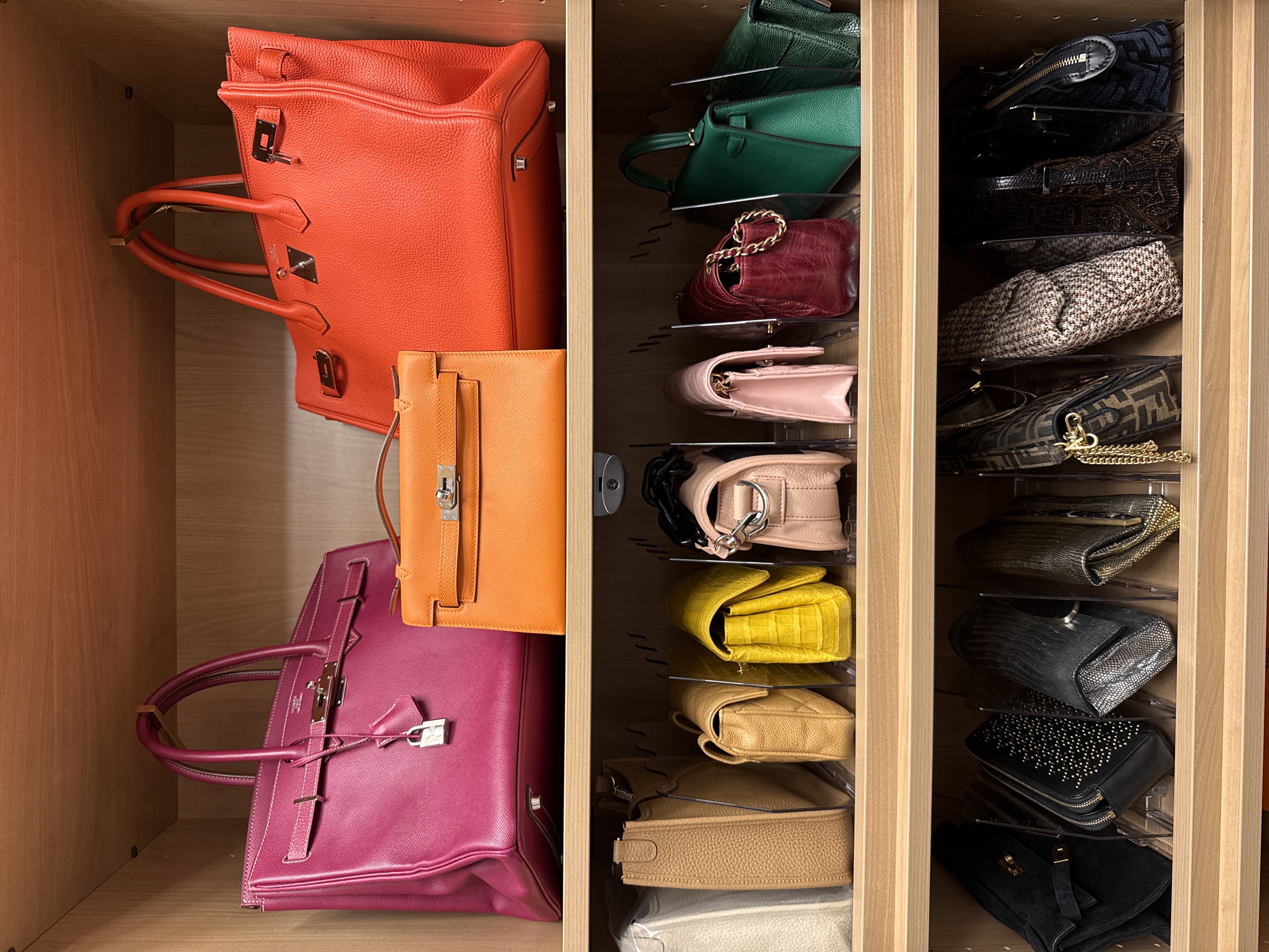 - Luxury closet system with organized handbags, shoes and curated wardrobe display
