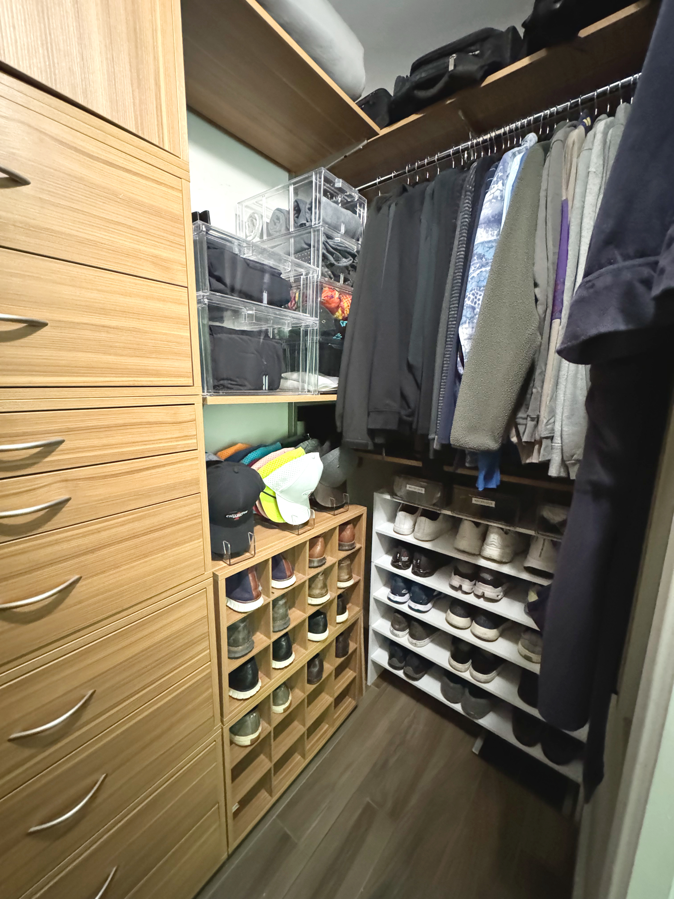 - Professionally organized walk-in closet with wardrobe system and shoe storage